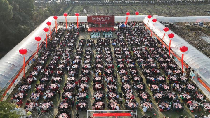 央视网消息“开饭咯!”2月11日是南方小年。随着一声喜庆的吆喝,一场以“雨邻有约庆新春·村企同心筑家园”为主题的全村团圆宴,在位于湖南省长沙市的跳马镇石燕湖村开席。近3000名村民、村域企业代表、帮扶共建单位嘉宾欢聚一堂,现场共设252桌团圆宴,暖意融融间盛满年味。