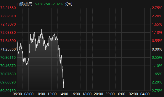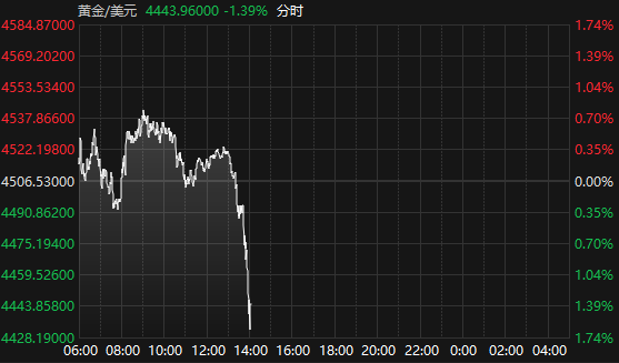 据Choice数据,3月26日,国际现货黄金午后短线跳水,截至14:05报4443.96美元/盎司,日内跌1.39%;现货白银报69.82美元/盎司,日内跌2.02%。